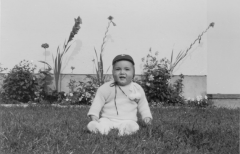 Durch das Aufhellen wird das Bild zwar schon besser als das Ausgangsbild, auch wirkt der Rasen schon detailierter und bei der Person (ja, bei dem Hosenscheißer handelt es sich um mich in meiner frühesten Jugend) ist der Unterschied nicht so gravierend, aber vor allem die Pflanzen im Hintergrund weisen kaum mehr eine Tiefe auf. Insgesamt ist das Bild zu kontrastarm.