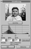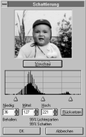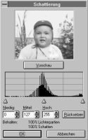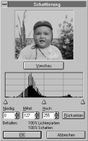 Viele Scanner bieten zwar die Möglichkeit, dies entweder automatisch einstellen zu lassen oder es per Hand vorzunehmen, jedoch kann es trotzdem nötig sein, noch Korrekturen vorzunehmen. Dazu benötigen Sie eine Bildbearbeitungssoftware, die über eine Histogramm-Funktion verfügt. Ich zeige hier ein Beispiel unter Verwendung von Corel Photo-Paint. Das Prinzip ist aber bei jeder Software gleich. In Corel Photo Paint versteckt sich diese Funktion unter "Effekte - Tonwert - Schattierung".
